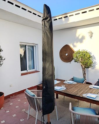 Yes, a lifting rod can make a big difference. If you’d rather avoid balancing on chairs or boxes to take off or put on your cover, choose a parasol cover with a lifting rod. Basic, budget-friendly versions come with a simple rod you insert inside, which works but can be a hassle. For greater ease of use, look for a cover with a lifting rod and a built-in storage space, making the cover much easier to control.